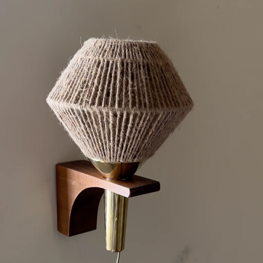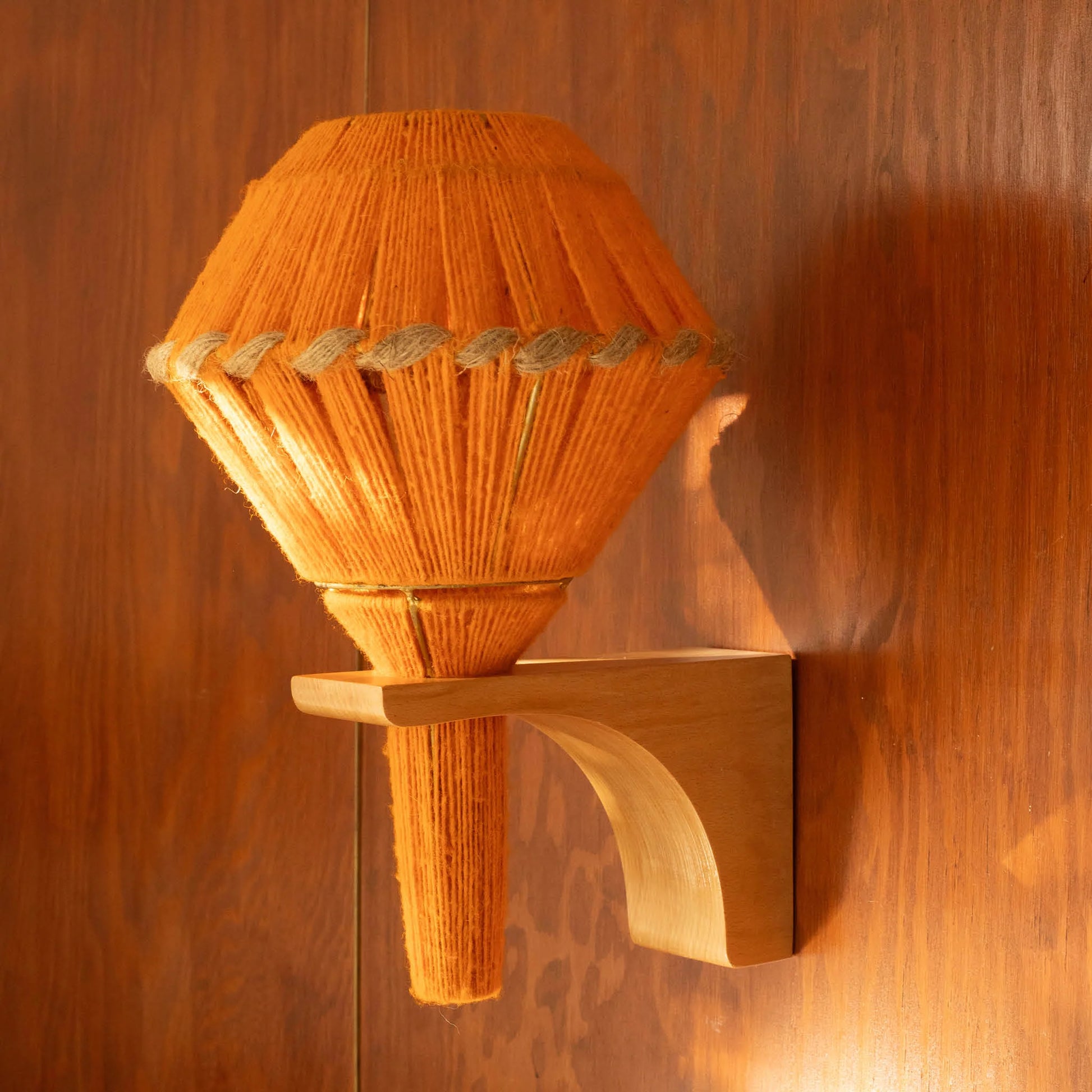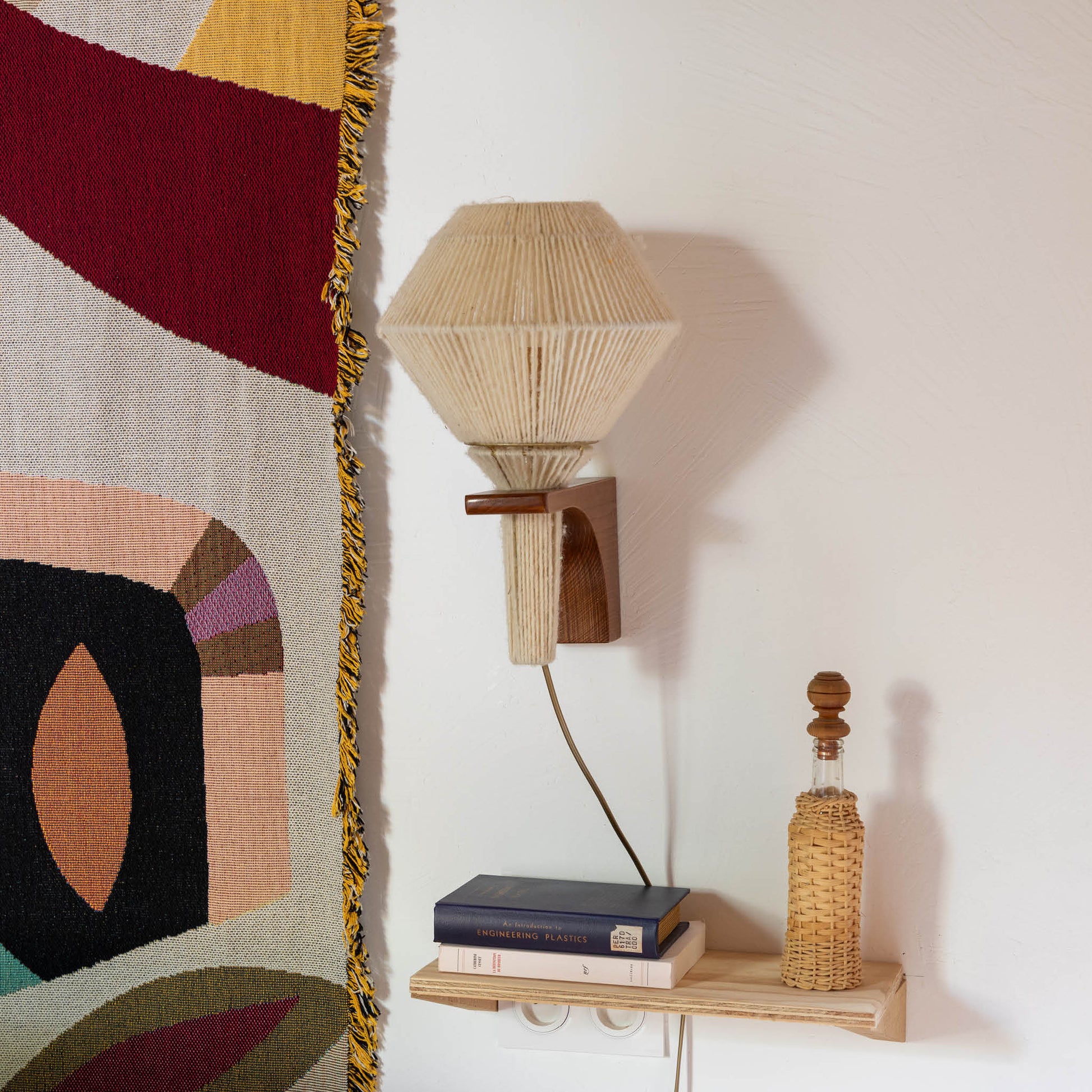 Dans sa version fibre naturelle, le pied du "flambeau" est en laiton. L'applique Libra est disponible avec un socle en bois clair et en version laine, elle est disponible en laine écru, orange ou bleu céladon.