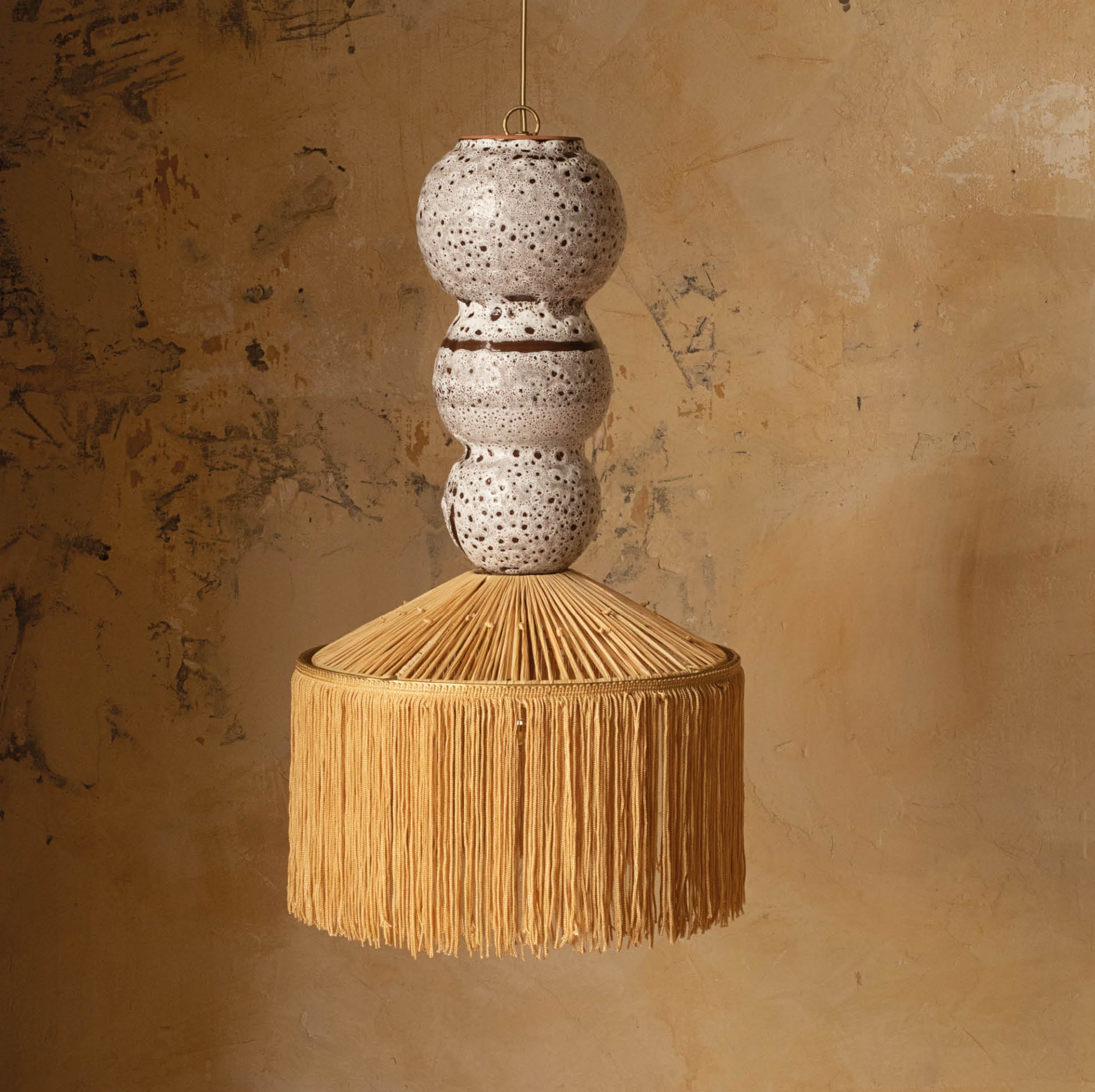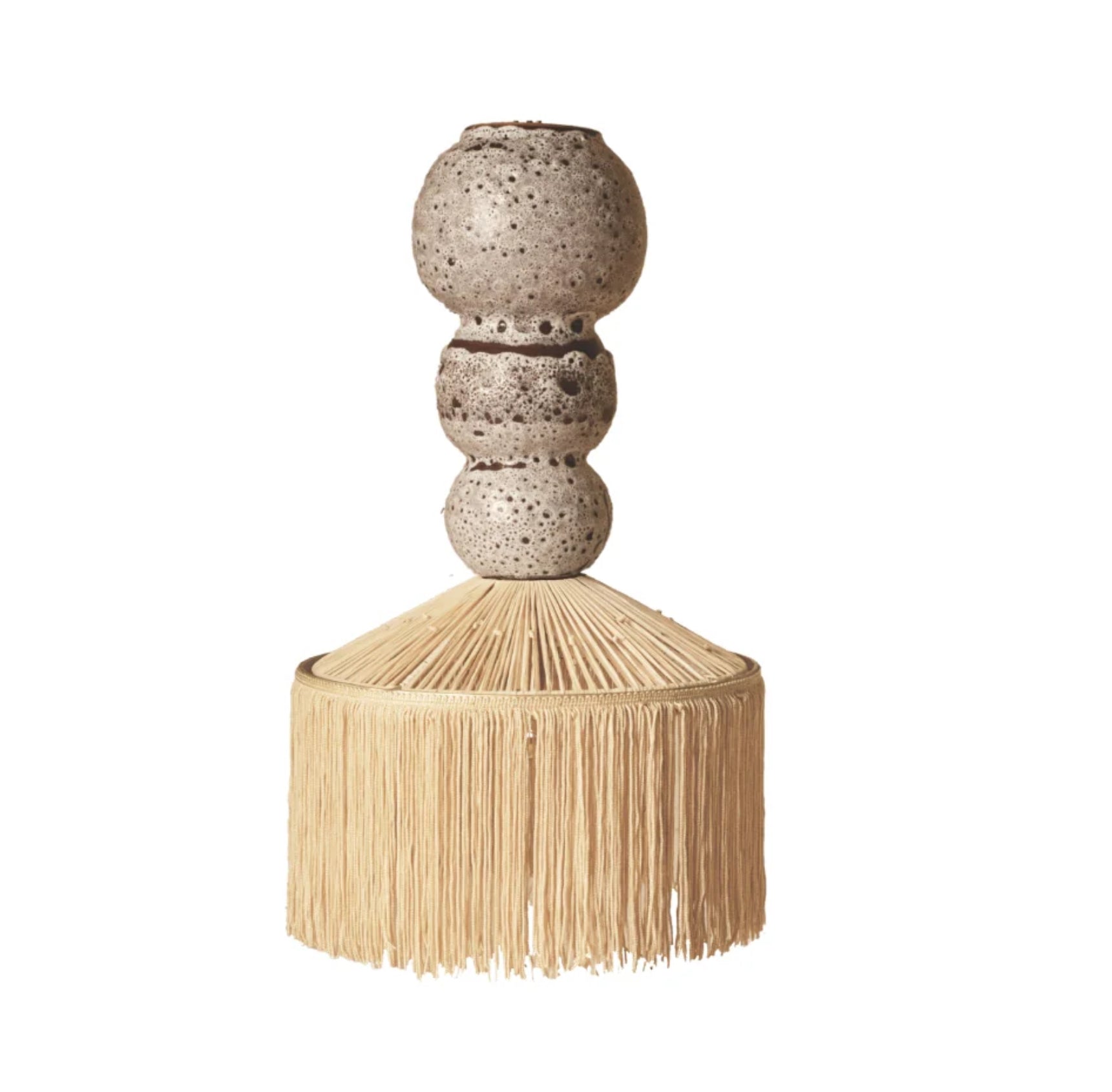 Son tronc en céramique est de forme organique, son abat-jour en raphia tressé est en forme de parasol, prolongé de longues franges dorées. Henriette illuminera votre pièce de centaines de rayons.