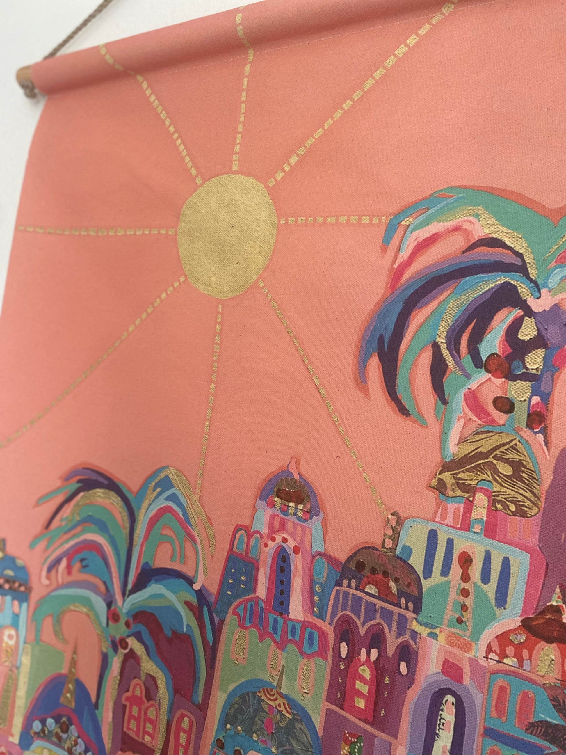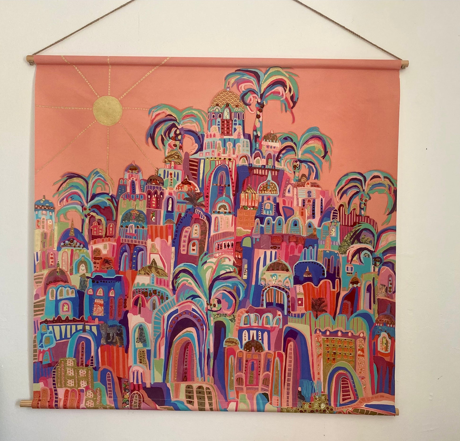 Apportez une dose de soleil et d'exotisme à votre intérieur avec cette magnifique tenture murale. Véritable invitation au voyage, cette œuvre illustre une cité imaginaire aux accents orientaux, où l’architecture organique rencontre une nature luxuriante sous un ciel rose poudré.