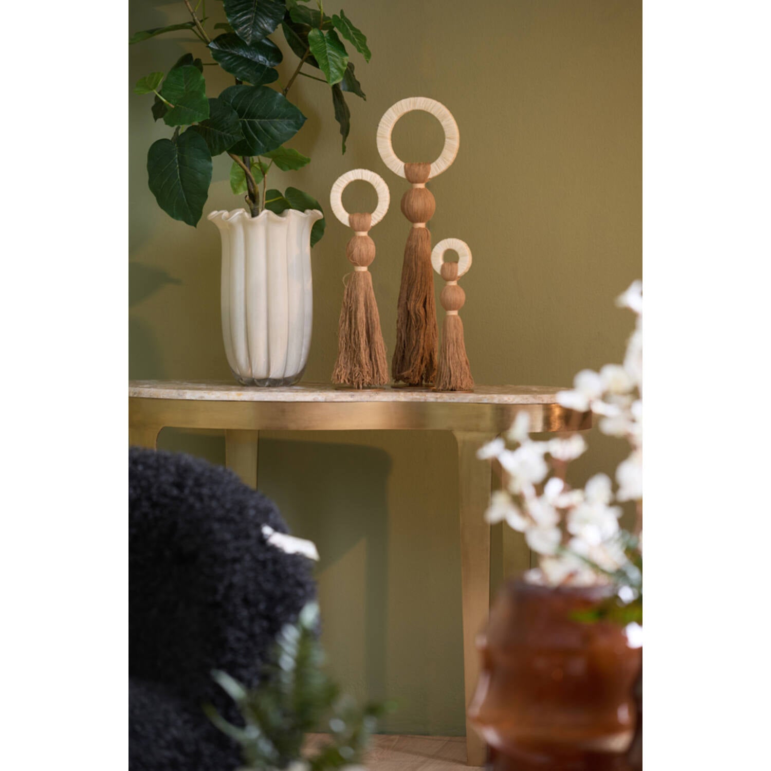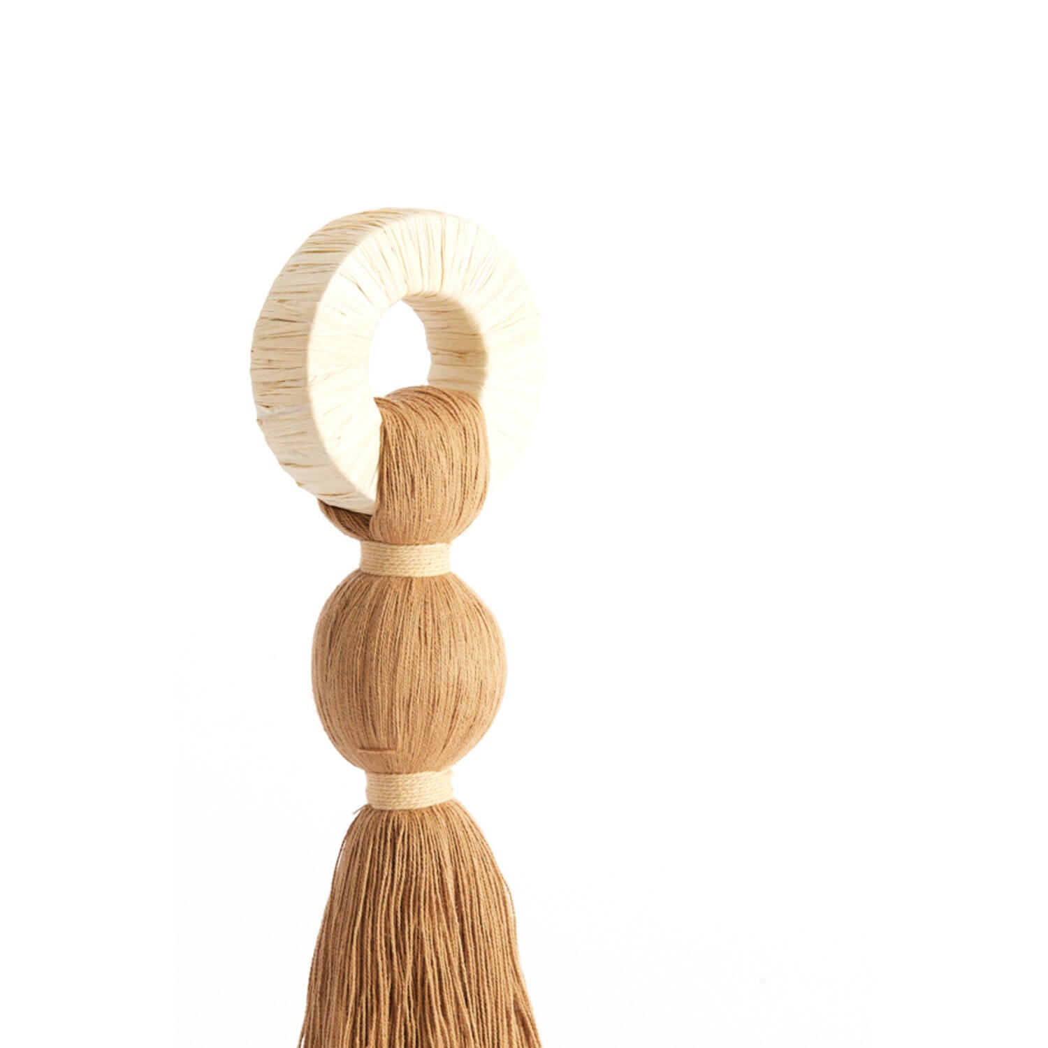 Ce totem se distingue par son jeu de contrastes : un anneau de raphia crème immaculé surmonte un corps en fibre de coton couleur ocre , structuré en une sphère parfaite avant de s'épanouir en un pompon généreux. C’est la pièce idéale pour briser la monotonie d'une étagère ou pour dynamiser un buffet.