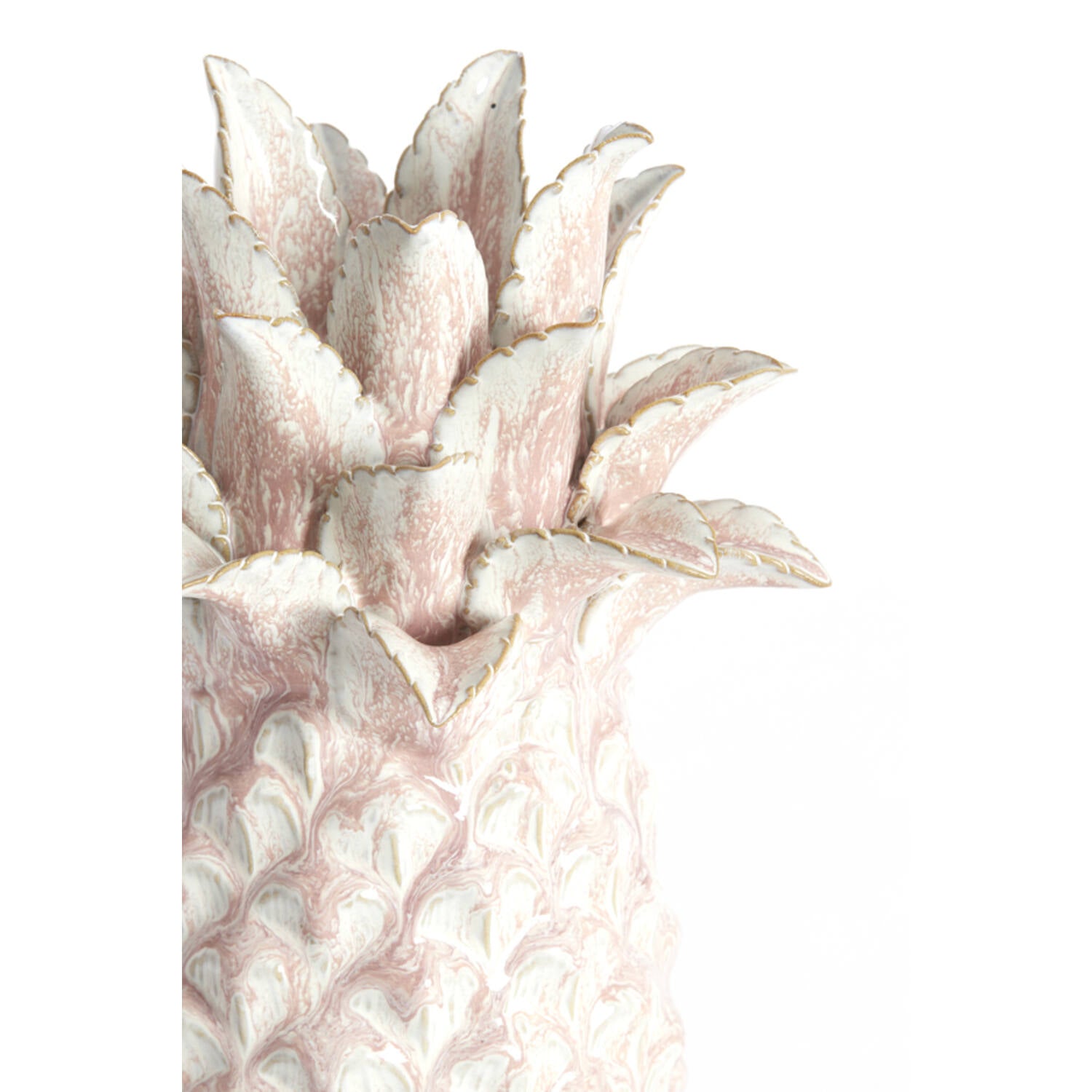 Ce vase arbore un effet marbré unique, mêlant des nuances de rose poudré et de blanc crème. Chaque écaille de l'ananas est sculptée en relief, créant un jeu d'ombre et de lumière qui donne vie à l'objet. Le souci du détail se poursuit jusqu'à la couronne de feuilles .