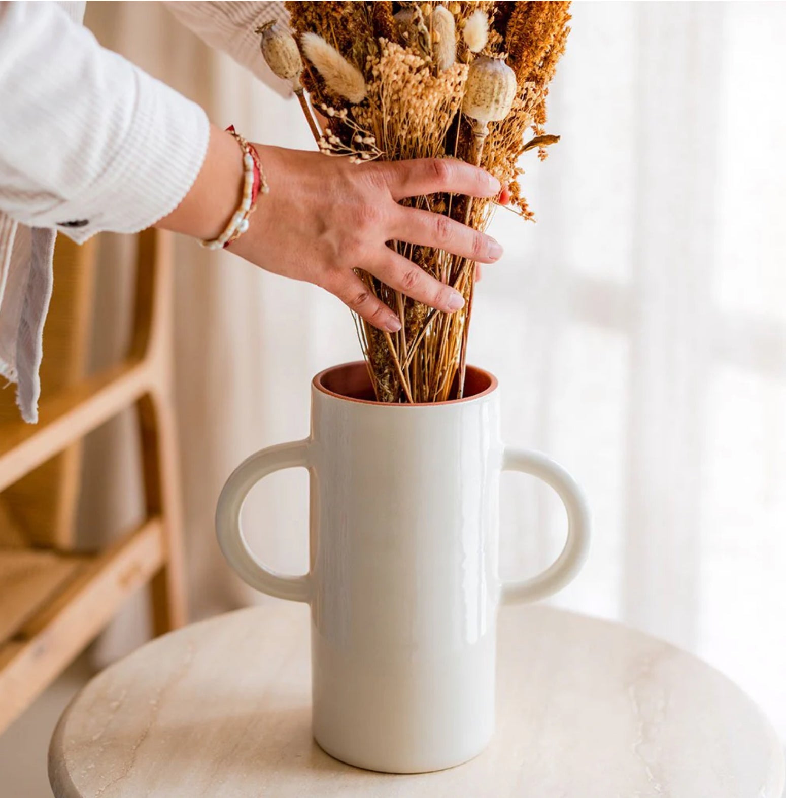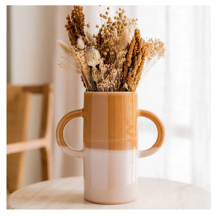Avec ses deux grandes anses, notre vase en céramique habillera vos tables et étagères de la plus belle et originale des façons. Il accueillera parfaitement vos fleurs séchées ou pourra même se suffire à lui même pour un intérieur chaleureux et ensoleillé.